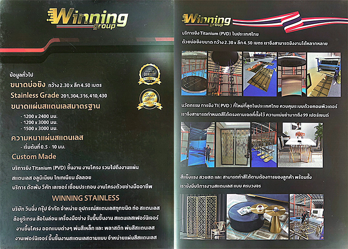 บริษัท วินนิ่ง กรุ๊ป จำกัด ( Winning group Co.,Ltd. ) ประกอบกิจการ ผลิต ขายส่ง ขายปลีก ผลิตภัณฑ์สแตนเลส และ รับพ่นสี รับเคลือบสีผลิตภัณฑ์สแตนเลส โลหะและพลาสติกทุกชนิดทุกประเภท บริษัทของเราให้บริการลูกค้ามายาวนานเป็นเวลากว่า 5 ปี